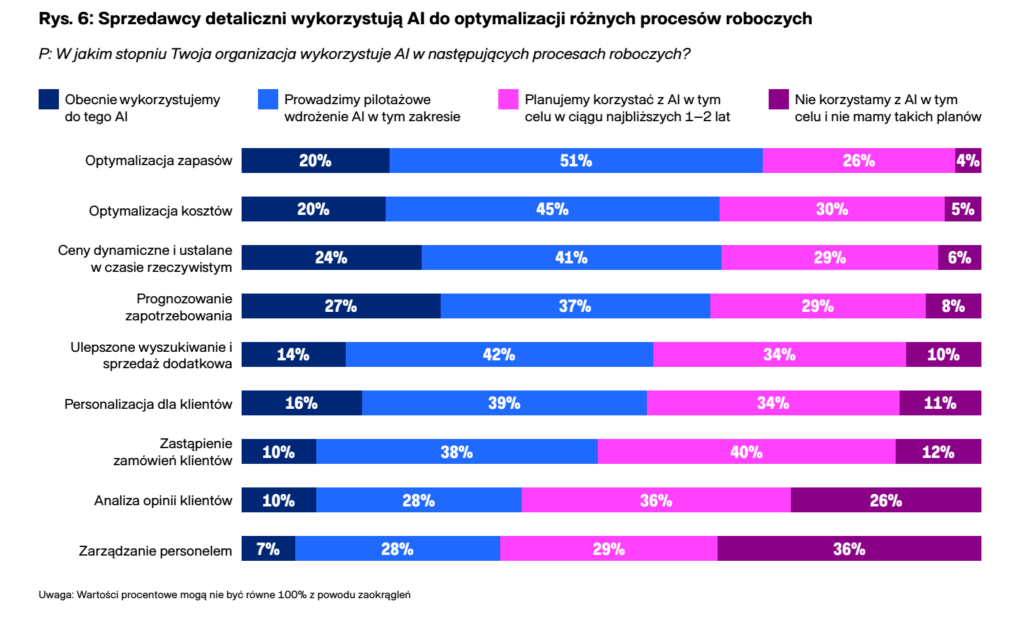 Oprócz zapasów, detaliści masowo testują AI w optymalizacji kosztów (45% w pilotażu) oraz ulepszonym wyszukiwaniu i sprzedaży dodatkowej (42% w pilotażu).